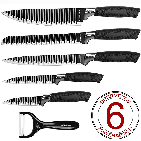 Высокая острота, надежное качество и стильный дизайн — это все, о нашем наборе кухонных ножей! Набор кухонных ножей MAYER&BOCH включает в себя 6 предметов: нож поварской, нож хлебный, нож разделочный, нож универсальный, нож для очистки, нож-пиллер. Наш набор ножей - это идеальный выбор истинных эстетов и профессионалов, прекрасное решение для тех, кто ценит надежные и качественные кухонные приспособления. Набор ножей с лезвиями из высококачественной нержавеющей станет незаменимым помощником на вашей кухне. Лезвия покрыты специальным антибактериальным Non-Stick покрытием, предотвращающим прилипание продуктов к лезвию ножа и обеспечивающим свежесть и гигиеничность продуктов при их нарезке. Поверхность клинков легко моется, не впитывает и не «передает» запахи пищи при параллельной нарезке различных продуктов. Благодаря острой заточке, ножи обладают высокими режущими свойствами. Нож поварской подходит от шинковки лука до разделки мяса. Хлебный нож гарантирует ровные ломтики не только свежей выпечки. Нож разделочный обеспечивает чистую и аккуратную разделку мяса. Овощной нож идеален для нарезки картофеля или моркови, удобно чистить овощи и фрукты. Нож кухонный универсальный подойдет для капусты, для теста, для сыра, для хлеба, для чистки овощей, для фруктов, это прекрасная шинковка для мяса, для картошки и зелени. Овощечистка прекрасно подходит для чистки различных овощей, фруктов, срезания цедры, и также для нарезания тонкими полосками. Кухонный набор ножей не только поможет вам с легкостью и быстротой разделывать продукты питания, но и подарит удовольствие от использования. Эргономичная ручка каждого изделия удобно ложится в ладонь, обеспечивая безопасную работу, комфортное положение в руке, надежный захват и не дает ножам скользить при использовании. Оригинальный дизайн изделий украсит вашу кухню, а благодаря красивой упаковке, такой набор ножей для кухни станет еще и прекрасным подарком! Порадуйте себя или удивите близкого человека этим отличным набором для кухни.