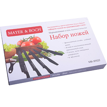 ОписаниеНабор ножей MAYER&BOCH состоит из 6-ти предметов. В наборе нож для очистки, поварской, хлебный, разделочный, универсальный и нож-пиллер. Все они разных размеров с лезвиями из высококачественной нержавеющей стали станет незаменимым помощником на Вашей кухне. Ножи идеально подойдут для резки как мяса и рыбы, так и сыра, фруктов и овощей. Эргономичная рукоятка каждого изделия удобно ложится в ладонь, обеспечивая безопасную работу, комфортное положение в руке, надежный захват и не дает ножам скользить при использовании. Поверхность клинков не впитывает и не «передает» запахи пищи при параллельной нарезке различных продуктов. Не подходит для мытья в посудомоечной машине. Мыть руками в теплой воде, используя моющее средство умеренной концентрации, затем ополоснуть и вытереть насухо. При необходимости ножи рекомендуется точить. Оригинальный дизайн набора и качество исполнения не оставят Вас равнодушными!