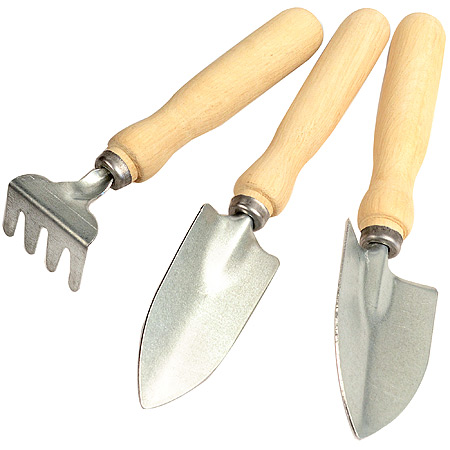 Горшечные цветы и растения требуют постоянного ухода, помимо полива и опрыскивания, необходимо рыхлить почву для лучшего доступа кислорода и воды к корням, а также периодически их пересаживать или рассаживать. Поэтому каждому цветоводу просто необходимы специальные инструменты, чтобы работать с землей. Миниатюрный садово-огородный инвентарь, состоящий из маленьких грабель и двух разных лопаток, отлично подходит для ухода за комнатными растениями. С их помощью можно копать, пропалывать, рыхлить почву и пересаживать цветы, не травмируя при этом сами растения. Гладкая деревянная ручка очень удобна при работе, прочные инструменты изготовлены из высококачественного материала, поэтому прослужат долгое время.