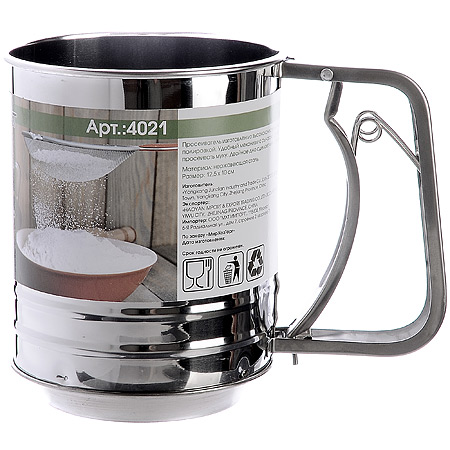 ОписаниеПросеиватель с ручнам механизмам поможет хозяйкам в приготовлении выпечки и блинов.Прочная сетка и корпус сита-кружки выполнены из нержавеющей стали. Изделие отличается прочностью и долговечностью, не подвергается коррозии и отвечает всем гигиеническим нормам и требованиям. Это необычное сито идеально для просеивания небольшого количества муки, разрыхлителя для теста и других мелких сыпучих ингредиентов. Рецепт блинов на молоке на упаковке.