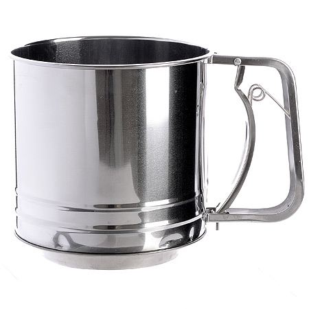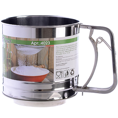 Просеиватель с ручнам механизмам поможет хозяйкам в приготовлении выпечки и блинов.Прочная сетка и корпус сита-кружки выполнены из нержавеющей стали. Изделие отличается прочностью и долговечностью, не подвергается коррозии и отвечает всем гигиеническим нормам и требованиям. Это необычное сито идеально для просеивания небольшого количества муки, разрыхлителя для теста и других мелких сыпучих ингредиентов. Рецепт блинов на молоке на упаковке.