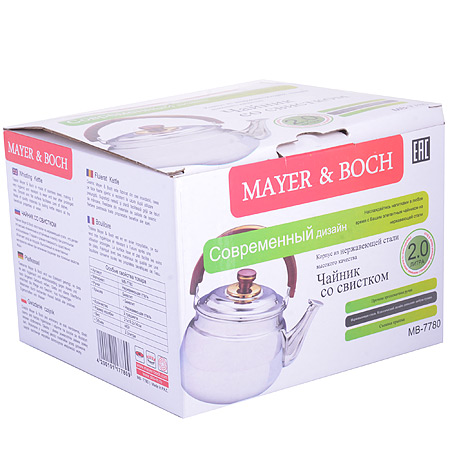 Чайники со свистком Mayer&Boch любят плиту,именно на ней они с особым усердием подогревают вам чай или кипятят воду. Металические чайники прочны,красивы и прослужат Вам много лет. Нержавеющая сталь не окисляется и не впитывает запахи, напитки всегда будут ароматны и меть настоящий вкус. Корпус с зеркальной поверхностью. Подвижная ручка из бакелита, делает использование чайника очень удобным и безопасным. Крышка снабжена свистком, что позволит вам контролировать процесс подогрева или кипячения воды. Капсулированное дно с прослойкой из алюминия обеспечивает наилучшее распределение тепла. Эстетичный и функциональный, с эксклюзивным дизайном, чайник будет оригинально смотреться в любом интерьере. Также изделие можно мыть в посудомоечной машине.