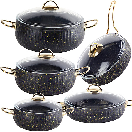 Набор кастрюль с крышками от MAYER&BOCH – идеальное решение для приготовления вкусных и здоровых блюд. В набор входят: кастрюля с крышкой 3 л, кастрюля с крышкой 4,5 л, кастрюля с крышкой 7 л, сотейник с крышкой 3 л и жаровня с крышкой 4 л. Набор кастрюль MAYER&BOCH - красивая и прочная литая алюминиевая посуда с антипригарным покрытием, что исключает возможность деформации и гарантирует долгий срок службы. Кастрюли с крышками не только являются незаменимыми в плане варки и тушения, но также могут быть использованы как сковороды, позволяя вам обжаривать продукты прямо внутри кастрюль. Мраморное антипригарное покрытие позволяет готовить практически не используя масло, что значительно увеличивает полезность приготовляемой еды. У кастрюли толстые стенки и дно, благодаря чему происходит равномерный нагрев поверхности, тепло сохраняется дольше. Вы сможете приготовить без лишнего использования масла или жира, сохраняя при этом непревзойденный вкус и аромат вашей еды. Набор кастрюль с антипригарным покрытием с крышкой деально подходят для приготовления разнообразных блюд – от супов и соусов до каши и пасты, плова, казан-кебаб, жаркое. Кастрюли с крышкой в комплекте из жаропрочного стекла, со стальным ободом. Набор кастрюли подходят для всех типов плит, кроме индукционных. Кастрюли снабжены крепкими металлическими ручками, которые обеспечивают удобный захват. Благодаря высокотехнологичному оборудованию, кастрюля алюминиевая безупречного качества и по доступной цене, соответствует стандартам качества и ГОСТ. Кастрюли простоты в уходе: мечта каждой хозяйки, они легко моются и не требуют специального ухода. Набор кастрюль с антипригарным покрытием имеет стильный дизайн с мраморным напылением прекрасно впишется в любой интерьер и станет украшением интерьера. Набор кастрюль MAYER&BOCH – это отличный подарок маме, бабушке, сестре, на Новый год, День рождения, 8 марта.
