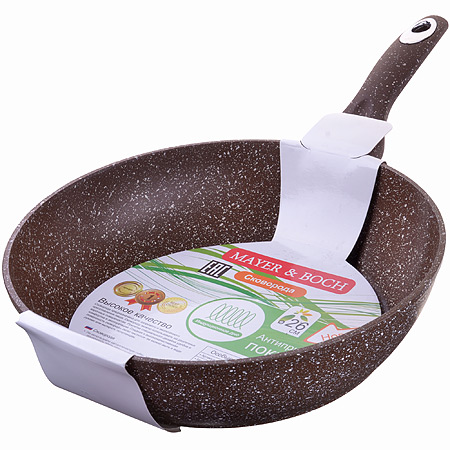 ОписаниеСковорода MAYER&BOCH выполнена из качественного литого алюминия и снабжена антипригарным покрытием особой прочности. Покрытие антипригарное жаропрочное, защищает сковороду от царапин, является экологически чистым и полностью безопасным, без вредных соединений и примесей. За счет того, что пища не пригорает и не пристает к покрытию сковороды, ее легко и быстро мыть. Прочное индукционное дно сковороды устойчиво к повреждениям и деформации. Эргономичная ручка из бакелита не нагревается и не скользит. Такая сковорода является незаменимой для жарки и тушения различных блюд. Подходит для использования на всех типах плит. Подходит для мытья в посудомоечной машине.