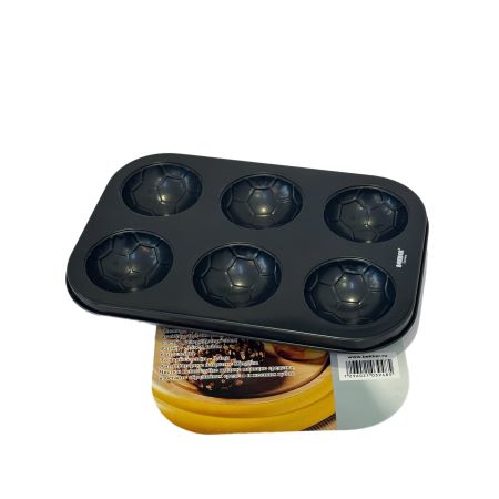 Изготовлена из углеродистой стали с двухслойным антипригарным покрытием. Углеродистая сталь обладает высокой теплопроводностью, что обеспечивает быстрый и равномерный нагрев, что важно для идеального приготовления. Благодаря антипригарному покрытию готовая выпечка легко отстает от стенок. Форма имеет 6 порционных отделений. диаметром 6,5 см, что очень удобно для выпекания кексов и пирожных. Внешне форма очень привлекательна, черного матового цвета. Не рекомендуется использовать металлические лопатки и ножи – они могут повредить покрытие. Лучше брать силиконовые или деревянные инструменты. Не использовать жесткие щетки, скребки и агрессивную химию – они разрушают антипригарный слой.