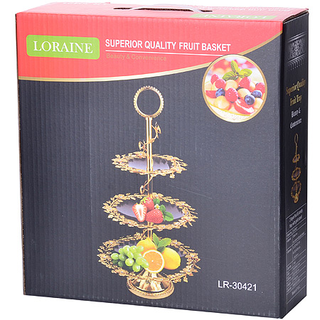 Элегантная конфетница LORAINE, выполненная из стекла, сочетает в себе изысканный дизайн с максимальной функциональностью. Конфетница состоит из 3-х ярусов разного размера и предназначена для красивой сервировки конфет, фруктов и десертов. Ярусы конфетницы оформлены оригинальным золотым орнаментом. Стойка-держатель конфетницы выполнена из стали с золотым покрытием. Конфетница украсит сервировку вашего стола и подчеркнет прекрасный вкус хозяина, а также станет отличным подарком.
