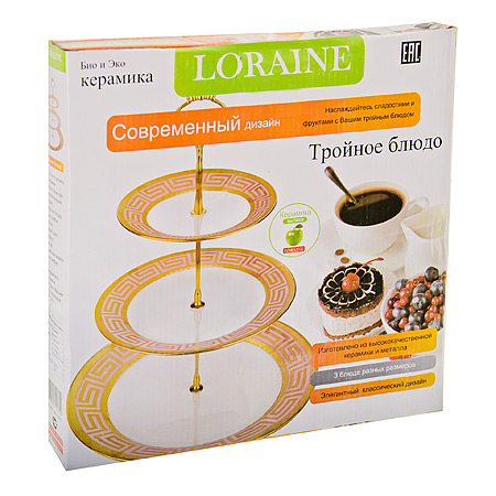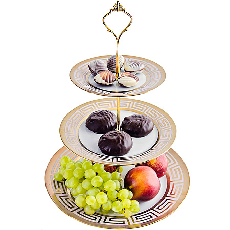 ОписаниеЭлегантная конфетница с тремя ярусами LORAINE станет настоящим украшением любого стола, поможет хозяйке красиво подать конфеты, фрукты, орехи, выпечку, овощи и даже закуски из мясных и сырных деликатесов. Блюдо выполнено из керамики высокого качества и украшено красивым орнаментом. Стойка-держатель выполнена из металла с золотым покрытием. Благодаря своей трехъярусной конструкции, этажерка на стол позволит вам разместить большое количество фруктов и сладостей. Основание фруктовницы обеспечивает ей высокую устойчивость, что делает ее безопасной для использования даже на самых неровных поверхностях. Вы можете быть уверены, что ваша ваза для фруктов будет стоять надежно, не опасаясь, что она может перевернуться или сломаться. Фруктовница трехъярусная прекрасно подойдёт под любой интерьер и будет сочетаться с сервировочной посудой, а компактные размеры позволят разместить ее даже на небольшом праздничном столе. Эта красивая посуда для дома украсит сервировку вашего стола и подчеркнет прекрасный вкус хозяина, а также станет отличным подарком.