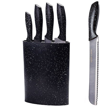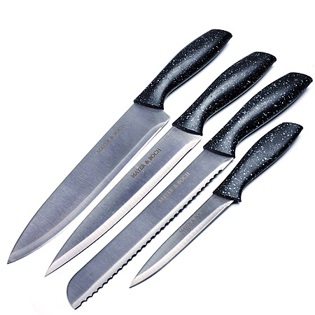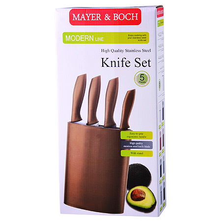 Набор ножей MAYER&BOCH состоит из 4-х ножей разного размера (поварского ножа, разделочного ножа и универсального ножа,нож для очистки), компактно складывающихся в оригинальную подставку-тубус из полипропилена. Лезвия выполнены из высококачественной нержавеющей стали, имеют износостойкую режущую кромку, благодаря чему ножи дольше остаются острыми, а эргономичные рукоятки ножей, выполненные из ПП, обеспечивают безопасную работу и комфортное положение в руке. Это прекрасные ножи для ежедневной резки фруктов, овощей и мяса. Изделия имеют гладкую, легко очищаемую поверхность. Оригинальный дизайн набора и качество исполнения не оставят Вас равнодушными. Набор MAYER&BOCH станет великолепным подарком и отлично украсит интерьер Вашей кухни!
