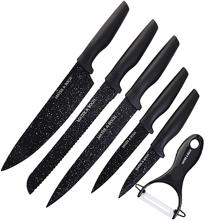 ОписаниеНабор ножей MAYER&BOCH состоит из 6-ти предметов. В наборе нож для очистки, поварской, хлебный, разделочный, универсальный и нож-пиллер. Все они разных размеров с лезвиями из высококачественной нержавеющей стали станет незаменимым помощником на Вашей кухне. Ножи идеально подойдут для резки как мяса и рыбы, так и сыра, фруктов и овощей. Эргономичная рукоятка каждого изделия удобно ложится в ладонь, обеспечивая безопасную работу, комфортное положение в руке, надежный захват и не дает ножам скользить при использовании. Поверхность клинков не впитывает и не «передает» запахи пищи при параллельной нарезке различных продуктов. Не подходит для мытья в посудомоечной машине. Мыть руками в теплой воде, используя моющее средство умеренной концентрации, затем ополоснуть и вытереть насухо. При необходимости ножи рекомендуется точить. Оригинальный дизайн набора и качество исполнения не оставят Вас равнодушными!