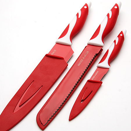 Набор из 3-х ножей MAYER&BOCH с лезвиями из высококачественной нержавеющей стали станет незаменимым помощником на вашей кухне. Лезвия покрыты специальным слоем, предотвращающим прилипание продуктов к лезвию ножа. Сечение ножей - клинообразно, что позволяет режущей кромке клинка быть продолжительное время острой. Поверхность клинков легко моется, не впитывает и не «передает» запахи пищи при параллельной нарезке различных продуктов. Набор ножей идеально подойдет для резки как мяса и рыбы, так и фруктов и овощей. Эргономичная рукоятка каждого изделия удобно ложится в ладонь, обеспечивая безопасную работу, комфортное положение в руке, надежный захват и не дает ножам скользить при использовании. Все ножи имеют полипропиленовые чехлы, обеспечивающие безопасность при хранении.