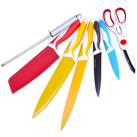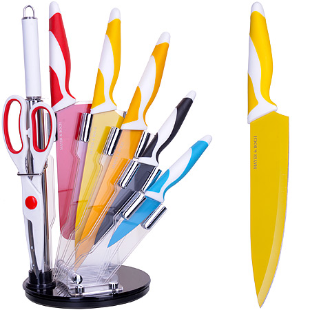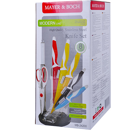 ОписаниеНабор ножей MAYER&BOCH с лезвиями из высококачественной нержавеющей стали станет незаменимым помощником на вашей кухне. Лезвия имеют специальное антибактериальное покрытие, предотвращающее прилипание продуктов к лезвию ножа и обеспечивающее свежесть и гигиеничность продуктов. Сечение ножей - клинообразно, что позволяет режущей кромке клинка быть продолжительное время острой. Поверхность клинков легко моется, не впитывает и не «передает» запахи пищи при нарезке различных продуктов. Набор ножей идеально подойдет для резки как мяса и рыбы, так и сыра, фруктов и овощей. Также в набор входят кухонные ножницы и мусат (точилка д/ножей). Эргономичная рукоятка каждого изделия удобно ложится в ладонь, обеспечивая безопасную работу, комфортное положение в руке, надежный захват и не дает ножам скользить при использовании. Все предметы набора компактно складываются в оригинальную подставку, которая поможет сэкономить место на рабочем столе. Яркий дизайн изделий украсит вашу кухню, а благодаря красивой упаковке, такой набор станет еще и прекрасным подарком! Не рекомендуется мыть в посудомоечной машине.
