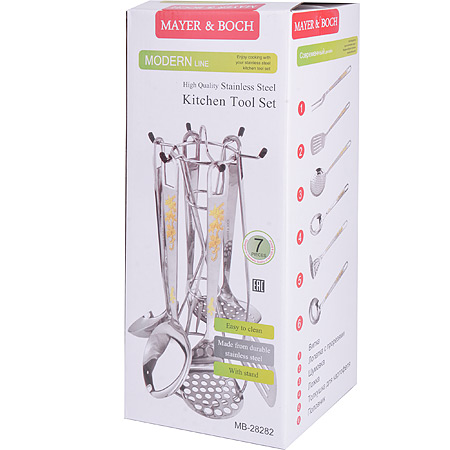 Профессиональный кухонный набор MAYER&BOCH очень удобен в использовании, имеет стильную стальную подставку, которая прекрасно впишется в любой кухонный интерьер. Удобные ручки изделий , также на ручках есть отверстия для подвешивания. Высококачественная нержавеющая сталь, из которой выполнены рабочие поверхности, идеально подходит для приготовления пищи.