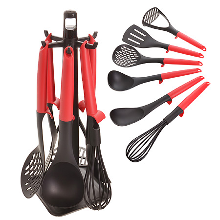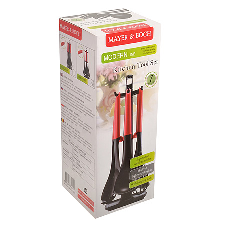 Кухонный набор MAYER&BOCH очень удобен в использовании, имеет стильную стойку-подставку, которая прекрасно впишется в любой кухонный интерьер. Приборы изготовлены из нейлона, нержавеющей стали и цветного полипропилена, отличаются высокой износоустойчивостью и надежностью, не окисляются со временем и не портят вкус продуктов, кроме того, они абсолютно безопасны для любых антипригарных покрытий. Кухонный набор придаст Вашей кухне элегантность, поднимет Ваше настроение и превратит приготовление еды в настоящее удовольствие! В набор входит: половник, ложка , шумовка, картофелемялка, лопатка с прорезями, венчик.