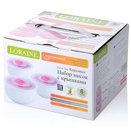 Набор салатниц с крышками LORAINE выполнен из керамики. Гибкая крышка сделана из пластика. Набор состоит из 3-х салатниц разного размера. Изделия декорированы орнаментом, сочетая в себе классический дизайн с максимальной функциональностью. Удобная крышка из пищевого пластика позволит дольше храниться приготовленным блюдам. Такой набор послужит отличным подарком к любому празднику, а также добавит элегантности и уюта любому праздничному столу! Посуда обладает гладкой непористой поверхностью, не впитывает запахи, легко моется. Подходит для мытья в посудомоечной машине.