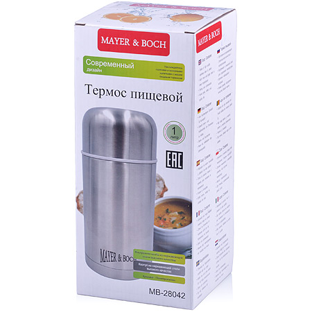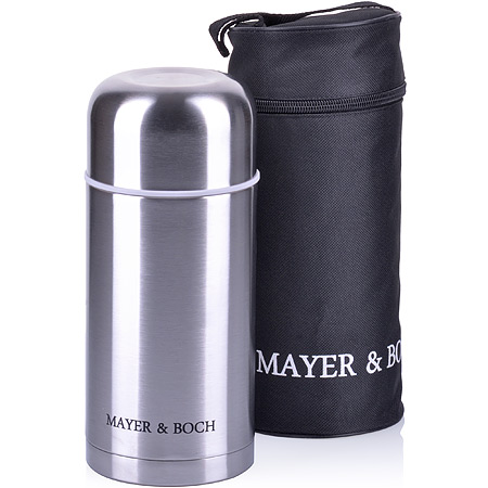 ОписаниеТермос с чехлом MAYER&BOCH выполнен из качественной нержавеющей стали, которая не вступает в реакцию с содержимым термоса и не изменяет вкусовых качеств напитка. Двойная стенка из нержавеющей стали сохраняет температуру на срок до 6-ти часов. Вакуумный закручивающийся клапан предохраняет от проливаний. Данная модель термоса прочная, долговечная и в тоже время легкая. Стильный металлический термос понравится абсолютно всем и впишется в любой интерьер кухни. Легко и просто моется.