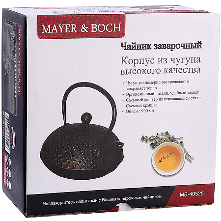 ОписаниеЗаварочный чайник чугунный с крышкой MAYER&BOCH станет для Вас отличным помощником в заваривании ароматного и по-настоящему вкусного чая. Красивый и компактный заварник изготовлен на современном оборудовании из чугуна высокого качества. Материал не выделяет вредных веществ под воздействием кипятка, а напитки каждый день будут радовать вас и вашу семью своим потрясающим вкусом. Удобный носик позволяет разлить чай по чашкам без проливания на стол. Внутренняя и внешняя поверхности покрыты термостойким лаком, который защищает металл от ржавчины и препятствует возникновению металлического привкуса у чая. Размещенный внутри него сетчатый фильтр гарантирует прозрачность и чистоту напитка от чайных листьев. За счет равномерного распределения тепла внутри изделия, чай получается максимально вкусным и насыщенным. Так как чугунные чайники дольше других удерживают тепло, то и вода в нем будет оставаться горячей и пригодной для заваривания чая долгое время. Заварочник оснащен эргономичной, не нагревающийся ручкой и плотно закрывается крышкой, защищая от ожогов паром. Благодаря своей эргономичной форме, заварочник чугунный удобно лежит в руке и обеспечивает комфорт при использовании. Посуда отлично держит тепло, позволяя чайным листьям полностью раскрыться. Украсит любую чайную церемонию, благодаря своему стильному восточному дизайну или просто станет прекрасным подарком на торжество. Отлично подойдет для травяных и ягодных сборов. Подходит для использования на всех типах плит, включая индукционные. Мыть без применения абразивных моющих средств. Не подходит для мытья в посудомоечной машине. Не подходит для использования на открытом огне. Заварной чайник будет идеальным подарком на Новый год, 14 февраля, 23 февраля, 8 марта, День рождения и Рождество!