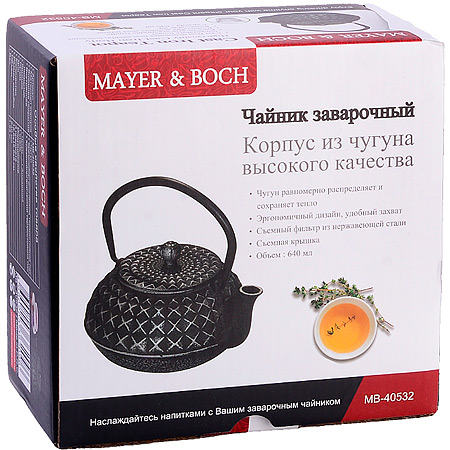 ОписаниеЗаварочный чайник чугунный с крышкой MAYER&BOCH станет для Вас отличным помощником в заваривании ароматного и по-настоящему вкусного чая. Красивый и компактный заварник изготовлен на современном оборудовании из чугуна высокого качества. Материал не выделяет вредных веществ под воздействием кипятка, а напитки каждый день будут радовать вас и вашу семью своим потрясающим вкусом. Удобный носик позволяет разлить чай по чашкам без проливания на стол. Внутренняя и внешняя поверхности покрыты термостойким лаком, который защищает металл от ржавчины и препятствует возникновению металлического привкуса у чая. Размещенный внутри него сетчатый фильтр гарантирует прозрачность и чистоту напитка от чайных листьев. За счет равномерного распределения тепла внутри изделия, чай получается максимально вкусным и насыщенным. Так как чугунные чайники дольше других удерживают тепло, то и вода в нем будет оставаться горячей и пригодной для заваривания чая долгое время. Заварочник оснащен эргономичной, не нагревающийся ручкой и плотно закрывается крышкой, защищая от ожогов паром. Благодаря своей эргономичной форме, заварочник чугунный удобно лежит в руке и обеспечивает комфорт при использовании. Посуда отлично держит тепло, позволяя чайным листьям полностью раскрыться. Украсит любую чайную церемонию, благодаря своему стильному восточному дизайну или просто станет прекрасным подарком на торжество. Отлично подойдет для травяных и ягодных сборов. Подходит для использования на всех типах плит, включая индукционные. Мыть без применения абразивных моющих средств. Не подходит для мытья в посудомоечной машине. Не подходит для использования на открытом огне. Заварной чайник будет идеальным подарком на Новый год, 14 февраля, 23 февраля, 8 марта, День рождения и Рождество!