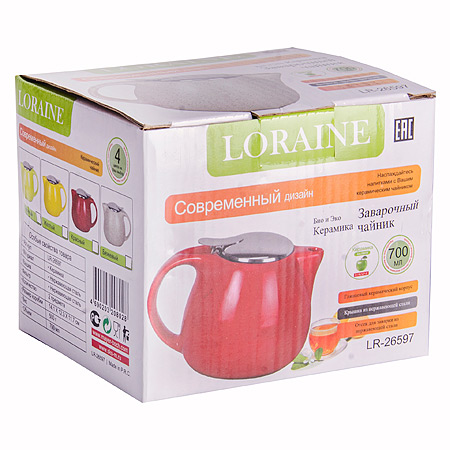 Заварочный чайник выполнен из высококачественной цветной керамики. Фильтр, из нержавеющей стали, для заваривания раскроет букет чая и не позволит чаинкам попасть в чашку. Удобная металлическая крышка поддержит нужную температуру для заваривания чая. Керамический чайник прост и удобен в применении, чайник легко мыть. Не ставьте чайник на открытый огонь и нагревающиеся поверхности. Подходит для мытья в посудомоечной машине.