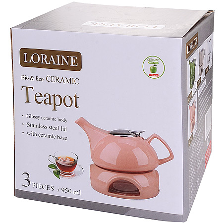 Заварочный чайник LORAINE изготовлен из керамики. Чайник оснащен керамической подставкой для подогрева, рассчитанной на одну греющую свечу. Изделия из керамики не впитывают запахи, благодаря чему Вы всегда получите натуральный, насыщенный вкус и аромат напитков. Заварочный чайник удобно использовать для повседневного заваривания чая практически любого сорта, но цветочные, фруктовые, красные и желтые сорта чая лучше других раскрывают свой вкус и аромат при заваривании именно в чайниках, а также сохраняют все полезные ферменты и витамины, содержащиеся в чайных листах. Фильтр гарантирует прозрачность и чистоту напитка от чайных листьев, при этом сохранив букет и насыщенность чая. Изящный заварочный чайник LORAINE будет прекрасно смотреться в любом интерьере. Не подходит для использования в микроволновой печи. Подходит для мытья в посудомоечной машине.