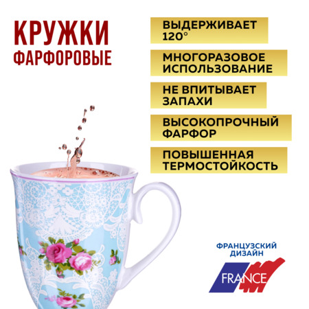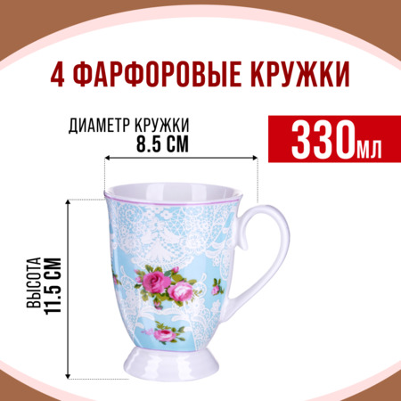 Набор кружек из 4 штук LORAINE - отличный выбор для повседневной жизни и праздничных мероприятий. Изготовленные из прочного фарфора, эти кружки для чая прослужат вам долгое время, сохраняя свой первозданный вид и яркость красок. Поэтому, даже спустя несколько лет, кофейный набор будет выглядеть точно так же, как и в день, когда вы начали им пользоваться. Нежные оттенки делают их изысканными и элегантными. Чашки имеют удобные и изящные ручки обеспечивают комфорт во время чаепития. Холодными вечерами из этой красивой посуды приятно выпить чая за просмотром любимого сериала, а ранним утром взбодриться глотком горячего кофе планируя список дел на день. Кружки большие, поэтому не стоит беспокоиться, что любимый напиток быстро закончится и вы не успеете им насладиться в полной мере. Стильный дизайн чашек придется по вкусу и ценителям классики, и тем, кто предпочитает утонченность и элегантность. Стильные и универсальные, они подойдут как для горячих, так и для холодных напитков, чая и кофе. Набор чашек отлично подойдет для вашего дома и впишется в любой интерьер, благодаря своему красивому дизайну. Он станет прекрасным дополнением к вашему чаепитию вместе с семьей или друзьями. Можно использовать в микроволновой печи и посудомоечной машине, а это в свою очередь позволяет сэкономить огромное количество времени и сил. Использование этих кружек будет делать каждый новый день настоящим праздником и принесет эстетическое удовольствие. Изделие упаковано в индивидуальную коробку и станет красивым и полезным подарком для ваших любимых.