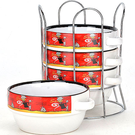 Набор супниц 5 пр LR (х8). Материал: керамика. Цвет: белый, красный. Подставка: нержавеющая сталь. Супница: D13,5 см. Объем: 420 мл. Размер упаковки: 17,4 х 17,5 х 21,2 см. Упаковка: коробка. Вес 2,3 кг. Страна производитель: Китай.