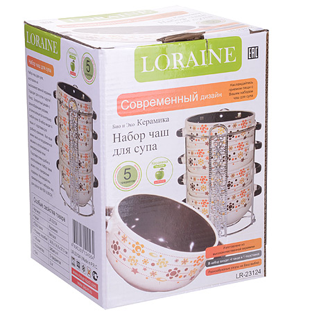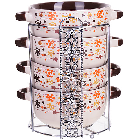 ОписаниеНабор из 4-х супниц LORAINE выполнен из высококачественной керамики и украшен декоративным рисунком. Супницы компактно располагаются на оригинальной подставке из нержавеющей стали и не занимают много места при хранении. В керамической посуде блюда сохраняют свои вкусовые качества, кроме того она обладает термической и химической прочностью. Благодаря оригинальному дизайну, такие супницы отлично подойдут как для ежедневного использования, так и