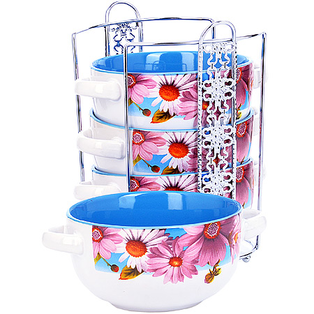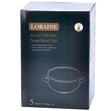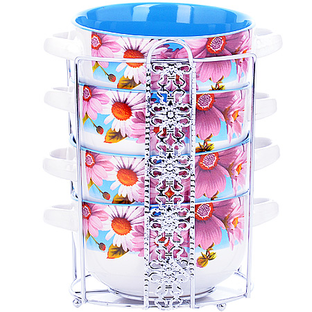 ОписаниеНабор из 4-х супниц LORAINE выполнен из высококачественной керамики и украшен декоративным рисунком. Супницы компактно располагаются на оригинальной подставке из нержавеющей стали и не занимают много места при хранении. В керамической посуде блюда сохраняют свои вкусовые качества, кроме того она обладает термической и химической прочностью. Благодаря оригинальному дизайну, такие супницы отлично подойдут как для ежедневного использования, так и для праздничной сервировки стола. Изделия оснащены двумя удобными ручками. В наборе: 4 супницы, 1 подставка. Подходит для мытья в посудомоечной машине.