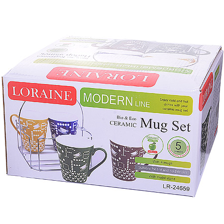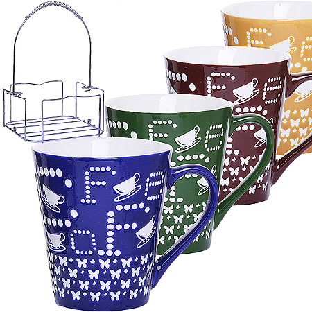 Набор из 4-х разноцветных кружек изготовлен из высококачественной керамики, украшен белым узором и стилизованной надписью "Coffee". Изящный дизайн придется по вкусу и ценителям классики, и тем, кто предпочитает современность. Он настроит на позитивный лад и подарит хорошее настроение с самого утра. Изделия можно компактно хранить на подставке, входящей в набор. Набор кружек - идеальный и необходимый подарок для вашего дома и для ваших друзей в праздники, юбилеи и торжества. Подходит для мытья посудомоечной машине.