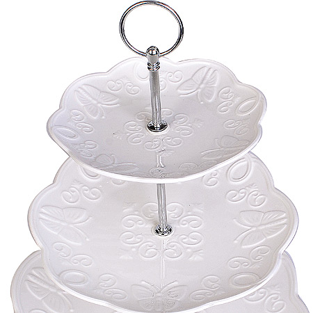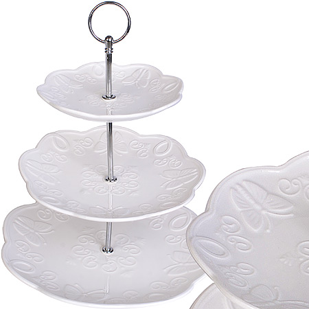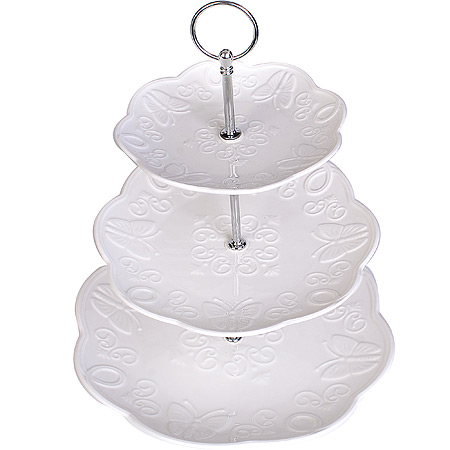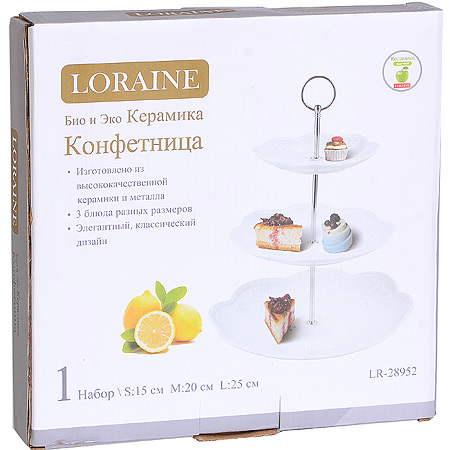 Элегантная конфетница 3-х ярусная LORAINE станет настоящим украшением любого стола, поможет хозяйке красиво подать конфеты, фрукты, орехи, выпечку, овощи и даже закуски из мясных и сырных деликатесов. Блюдо сервировочное выполнено из высококачественной керамики. Стойка-держатель выполнена из металла с серебряным покрытием. Благодаря своей трехъярусной конструкции, этажерка на стол позволит вам разместить большое количество сладостей. Ножка фруктовницы обеспечивает ей высокую устойчивость, что делает ее безопасной для использования даже на самых неровных поверхностях. Вы можете быть уверены, что ваша ваза для фруктов будет стоять надежно, не опасаясь, что она может перевернуться или сломаться. Фруктовница трехъярусная прекрасно подойдёт под любой интерьер и будет сочетаться с сервировочной посудой, а компактные размеры позволят разместить ее даже на небольшом праздничном столе. Эта красивая посуда для дома украсит сервировку вашего стола и подчеркнет прекрасный вкус хозяина, а также станет отличным подарком.