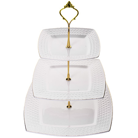 Элегантная конфетница 3-х ярусная LORAINE станет настоящим украшением любого стола, поможет хозяйке красиво подать конфеты, фрукты, орехи, выпечку, овощи и даже закуски из мясных и сырных деликатесов. Блюдо на ножке выполнено из высококачественного, ударопрочного стекла. Стойка-держатель выполнена из металла с золотистым покрытием. Благодаря своей трехъярусной конструкции, этажерка на стол позволит вам разместить большое количество сладостей. Ножка фруктовницы обеспечивает ей высокую устойчивость, что делает ее безопасной для использования даже на самых неровных поверхностях. Вы можете быть уверены, что ваша ваза для фруктов будет стоять надежно, не опасаясь, что она может перевернуться или сломаться. Фруктовница трехъярусная прекрасно подойдёт под любой интерьер и будет сочетаться с сервировочной посудой, а компактные размеры позволят разместить ее даже на небольшом праздничном столе. Эта красивая посуда для дома украсит сервировку вашего стола и подчеркнет прекрасный вкус хозяина, а также станет отличным подарком.