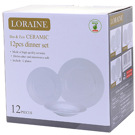 Набор посуды LORAINE выполнен из фарфора. Набор предназначен для сервировки обеденного стола. Включает в себя 12 предметов и рассчитан на четыре персоны: обеденные тарелки 4 шт, суповые тарелки 4 шт, десертные тарелки 4 шт. Форма изделий круглая. Классический дизайн сочетается в нем с максимальной функциональностью. Такой набор послужит отличным подарком к любому празднику, а также добавит элегантности и уюта любому праздничному столу! Посуда обладает гладкой непористой поверхностью, не впитывает запахи, устойчива к перепадам температуры и легко моется. Можно использовать данную посуду в микроволной печи. Подходит для мытья в посудомоечной машине.