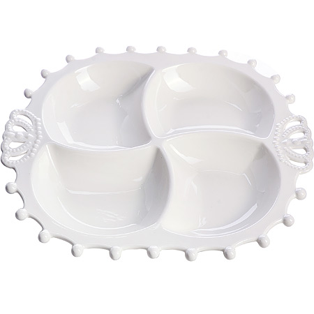 Менажница фарфоровая LORAINE — это не просто посуда, а настоящее произведение искусства, способное добавить нотку элегантности и утонченности в любую сервировку стола. Сочетание изысканного дизайна, высококачественных материалов и продуманной функциональности делает эту модель незаменимым аксессуаром для праздничного стола или уютных семейных ужинов. Ее выразительная форма с плавными линиями и рельефный узор в виде короны создают эффект роскоши и изысканности. Четыре идеально симметричных отделения обеспечивают достаточно пространства для размещения различных лакомств. Это прекрасное решение для подачи конфет, варенья и джемов, а также идеально подойдет для сервировки оливок, сыра, соусов и мелких закусок. Каждое отделение обращает на себя внимание, заставляя гостей задержать взгляд на красиво оформленной подаче. Менажница LORAINE станет великолепным акцентом на любом столе, подчеркивая вкус и стиль хозяйки. К тому же, она практична в использовании: легкая и удобная в обращении, она быстро моется и не занимает много места при хранении. Благодаря своему функциональному дизайну, она отлично подходит как для повседневного, так и для праздничного использования. Это блюдо для подачи — отличный вариант подарка для любой ситуации: будь то день рождения, юбилей или просто знак внимания и заботы. Оно порадует маму, бабушку, подругу или коллегу, добавив в их жизнь немного изыска и радости. Сервировочное блюдо LORAINE — это символ внимания к деталям и любви к прекрасному, который найдет свое место в каждом доме.