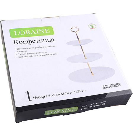 Элегантная конфетница LORAINE, выполненная из фарфора, сочетает в себе изысканный дизайн с максимальной функциональностью. Конфетница состоит из 3-х тарелок-ярусов разного размера и предназначена для красивой сервировки конфет, фруктов и десертов. Блюда конфетницы оформлены оригинальным орнаментом. Центральная стойка блюда-этажерки изготовлена из металла. Фруктовница украсит сервировку вашего стола и подчеркнет прекрасный вкус хозяина, а также станет отличным подарком для женщин: мам, бабушек,жен.