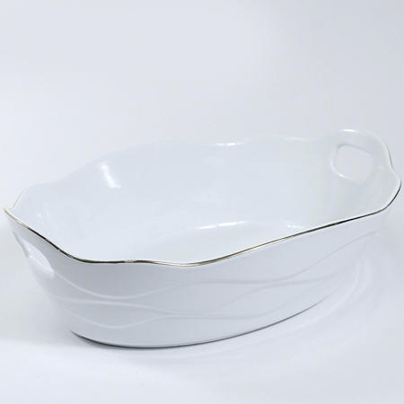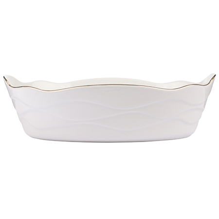 Блюдо сервировочное LORAINE – это стильное решение для любого торжества. Этот элемент декора создаст атмосферу роскоши на вашем празднике. Посуда для сервировки изготовлена из керамики высокого качества. Окантовка золотого цвета придает изделию особый шик и элегантность, подчеркивая его премиальность. Благодаря своим размерам 32x21x9,5 см блюдо для подачи подойдет для легких закусок, фруктов, овощей, свежей выпечки, десертов, печенья, сыров, салатов, и даже для таких блюд как шашлык, плов, картофель, блюда из рыбы и мяса – эта посуда сервировочная справится со всеми кулинарными задачами. Блюдо овальное LORAINE сочетает в себе функциональность и эстетику. Возможность мытья в посудомоечной машине делает уход за ним максимально простым и удобным. Практичность и удобство использования делают эту посуду для сервировки незаменимым помощником на кухне. Такое декоративное блюдо обязательно понравится тем, кто ценит практичность и красоту в одном предмете. Это блюдо сервировочное белое может стать замечательным подарком для истинных ценителей эстетики и оформления стола. Оно подарит радость от каждой трапезы и будет радовать глаз своей изысканностью. Добавьте нотку элегантности и уюта вашему столу вместе с LORAINE!