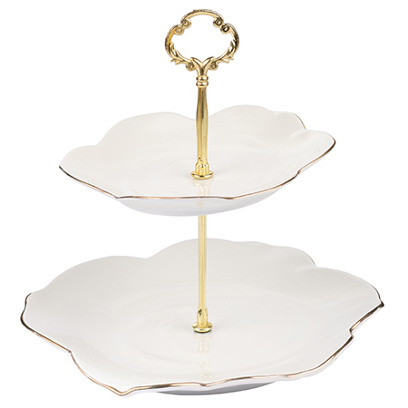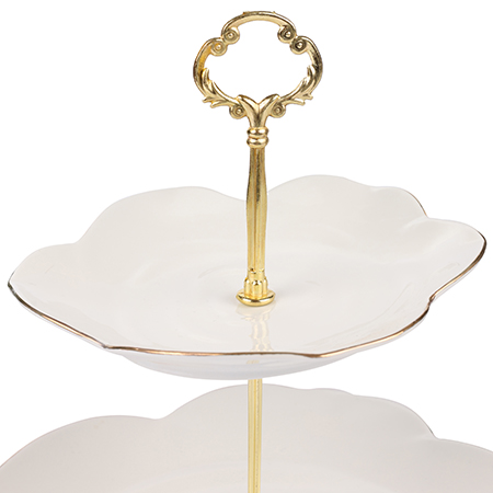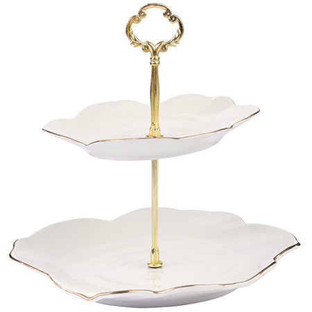Элегантная двухъярусная конфетница от бренда LORAINE является великолепным дополнением любого праздничного стола. Она создана для того, чтобы украсить подачу различных сладостей, конфет, фруктов, орехов, пирожных, а также для сервировки овощных и мясных закусок. Эта оригинальная посуда для сервировки выполнена из высококачественной керамики с добавлением металлического покрытия, придающего ей роскошный золотистый оттенок. Двухъярусная конструкция блюда для подачи позволяет максимально эффективно использовать пространство, вмещая большое количество угощений. Уникальная форма каждого уровня этажерки создает дополнительную эстетику и позволяет наслаждаться каждой деталью. Верхний ярус украшен элегантной ручкой, а нижний ярус оформлен в виде устойчивого основания, обеспечивающего надежность всей конструкции. Дизайн этой конфетницы был тщательно продуман, чтобы она не только радовала глаз, но и была функциональна. Устойчивость сервировочной посуды, простота в использовании делают ее незаменимой на любом празднике или торжестве. Важным преимуществом данной керамической этажерки является ее универсальность – она отлично подходит как для повседневного использования, так и для особых случаев. Компактные размеры позволяют ей гармонично вписаться в любой интерьер, привнося атмосферу утонченность и элегантность. Эта белая фруктовница этажерка будет идеальным подарком для людей, ценящих красоту и комфорт в быту. Этажерка для фруктов и конфет от LORAINE – это не просто декоративный элемент, а настоящее произведение искусства, способное превратить обычную трапезу в настоящий праздник вкуса и эстетики.