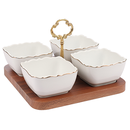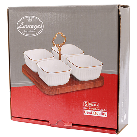 Менажница LORAINE — настоящая находка для тех, кто стремится превратить обыденный прием пищи в настоящий праздник вкуса и эстетики. Посуда для сервировки выполнена из высококачественной керамики, известной своими превосходными эксплуатационными характеристиками и непревзойденной красотой. Белый цвет подчеркивает чистоту и благородство материала, придавая изделию особую элегантность. Набор менажниц состоит из 4 отдельных тарелок для нарезки, сладостей, соединенных между собой для максимального удобства использования. Каждая секция имеет объем 200 мл, что позволяет одновременно подавать несколько видов закусок, десертов, фруктов, сыров, орехов, соусов, снеков, сухофруктов, варенья, меда и конфет. Устойчивая подставка с ручкой облегчает перенос блюда, обеспечивая надежность и безопасность при использовании. Такое решение делает менажницу не только стильным аксессуаром, но и практичным инструментом для создания красивой сервировки. Блюдо подходит для различных типов мероприятий — от семейного ужина до званого обеда, позволяя продемонстрировать гостям ваш вкус и внимание к деталям. Прочность и долговечность керамики гарантируют, что подарочная посуда сохранит свой первоначальный вид и функциональность на протяжении многих лет. Оформление каждой секции отличается оригинальностью и изысканностью, привлекая внимание и вызывая восхищение у всех присутствующих. Стильный дизайн гармонично сочетается с любым интерьером, добавляя нотку роскоши и уюта в атмосферу помещения. Этот набор посуды не только удобен в использовании, но и функционален. Он позволяет эффектно подать разнообразные блюда, будь то холодные закуски, горячие мясные блюда, свежие салаты или изысканные десерты, а также собрать сырную тарелку или пивную тарелку. Каждое угощение будет выглядеть аппетитно и привлекательно, благодаря продуманному разделению на порции. Менажница керамическая станет настоящим украшением вашей кухни и отличным подарком для друзей и близких, которые ценят эстетичную посуду и изысканную сервировку.