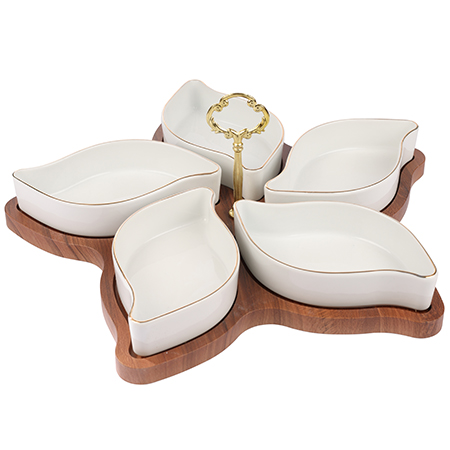 Менажница LORAINE — настоящая находка для тех, кто стремится превратить обыденный прием пищи в настоящий праздник вкуса и эстетики. Посуда для сервировки выполнена из высококачественной керамики, известной своими превосходными эксплуатационными характеристиками и непревзойденной красотой. Белый цвет подчеркивает чистоту и благородство материала, придавая изделию особую элегантность. Набор менажниц состоит из 5 отдельных тарелок для нарезки, сладостей, соединенных между собой для максимального удобства использования. Каждая секция имеет объем 250 мл, что позволяет одновременно подавать несколько видов закусок, десертов, фруктов, сыров, орехов, соусов, снеков, сухофруктов, варенья, меда и конфет. Устойчивая подставка с ручкой облегчает перенос блюда, обеспечивая надежность и безопасность при использовании. Такое решение делает менажницу не только стильным аксессуаром, но и практичным инструментом для создания красивой сервировки. Блюдо подходит для различных типов мероприятий — от семейного ужина до званого обеда, позволяя продемонстрировать гостям ваш вкус и внимание к деталям. Прочность и долговечность керамики гарантируют, что подарочная посуда сохранит свой первоначальный вид и функциональность на протяжении многих лет. Оформление каждой секции отличается оригинальностью и изысканностью, привлекая внимание и вызывая восхищение у всех присутствующих. Стильный дизайн гармонично сочетается с любым интерьером, добавляя нотку роскоши и уюта в атмосферу помещения. Этот набор посуды не только удобен в использовании, но и функционален. Он позволяет эффектно подать разнообразные блюда, будь то холодные закуски, горячие мясные блюда, свежие салаты или изысканные десерты, а также собрать сырную тарелку или пивную тарелку. Каждое угощение будет выглядеть аппетитно и привлекательно, благодаря продуманному разделению на порции. Менажница керамическая станет настоящим украшением вашей кухни и отличным подарком для друзей и близких, которые ценят эстетичную посуду и изысканную сервировку.