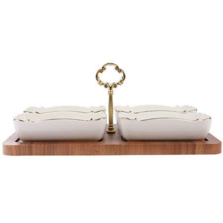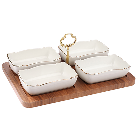 Менажница LORAINE — настоящая находка для тех, кто стремится превратить обыденный прием пищи в настоящий праздник вкуса и эстетики. Посуда для сервировки выполнена из высококачественной керамики, известной своими превосходными эксплуатационными характеристиками и непревзойденной красотой. Белый цвет подчеркивает чистоту и благородство материала, придавая изделию особую элегантность. Набор менажниц состоит из 4 отдельных тарелок для нарезки, сладостей, соединенных между собой для максимального удобства использования. Каждая секция имеет объем 300 мл, что позволяет одновременно подавать несколько видов закусок, десертов, фруктов, сыров, орехов, соусов, снеков, сухофруктов, варенья, меда и конфет. Устойчивая подставка с ручкой облегчает перенос блюда, обеспечивая надежность и безопасность при использовании. Такое решение делает менажницу не только стильным аксессуаром, но и практичным инструментом для создания красивой сервировки. Блюдо подходит для различных типов мероприятий — от семейного ужина до званого обеда, позволяя продемонстрировать гостям ваш вкус и внимание к деталям. Прочность и долговечность керамики гарантируют, что подарочная посуда сохранит свой первоначальный вид и функциональность на протяжении многих лет. Оформление каждой секции отличается оригинальностью и изысканностью, привлекая внимание и вызывая восхищение у всех присутствующих. Стильный дизайн гармонично сочетается с любым интерьером, добавляя нотку роскоши и уюта в атмосферу помещения. Этот набор посуды не только удобен в использовании, но и функционален. Он позволяет эффектно подать разнообразные блюда, будь то холодные закуски, горячие мясные блюда, свежие салаты или изысканные десерты, а также собрать сырную тарелку или пивную тарелку. Каждое угощение будет выглядеть аппетитно и привлекательно, благодаря продуманному разделению на порции. Менажница керамическая станет настоящим украшением вашей кухни и отличным подарком для друзей и близких, которые ценят эстетичную посуду и изысканную сервировку.
