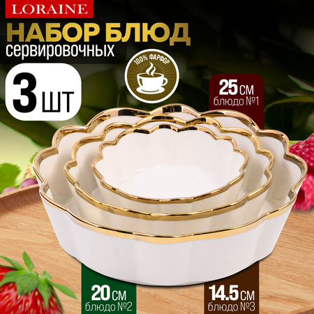 ОписаниеНабор красивых и декоративных фарфоровых блюд LORAINE станет идеальным элементом сервировки стола в вашем доме. Эти сервировочные тарелки разных размеров идеально подходят для подачи различных блюд, таких как салаты, горячие блюда, овощи, фрукты, хлеб, выпечка, сыры и сладости. Тарелки для подачи изготовлены из высококачественного фарфора и их можно использовать не только для сервировки, но и для украшения стола. Фарфор всегда актуален и эти блюда для подачи не исключение. Набор блюд сервировочных украсит любую сервировку и станет изюминкой вашей кухни. Набор блюд станет прекрасным подарком на любой праздник, будь то день рождения или свадьба. Фарфоровая посуда не только красива, но и практична. Сервировочные тарелки отлично подойдут для подачи различных блюд, которые нужно хранить в холодильнике. Красивая, удобная и практичная кухонная посуда станет прекрасным дополнением к вашей коллекции декоративных и сервировочных предметов.