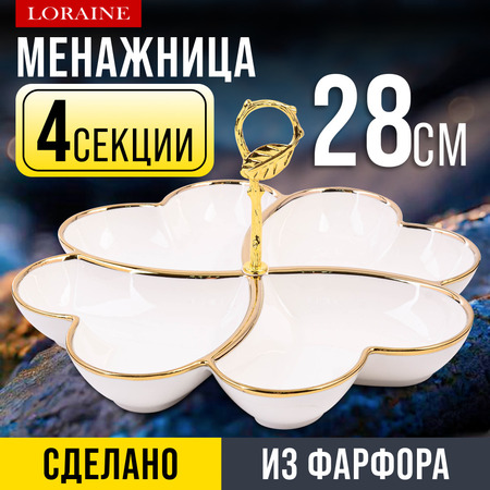 Элегантная менажница LORAINE — это изысканное произведение искусства, созданное для тех, кто ценит утончённость и комфорт. Изготовленная из высококачественного фарфора, она поражает своей красотой и оригинальностью. Форма менажницы фигурная, состоящая из четырёх секций, что придаёт ей особую изящность и элегантность. Удобная ручка для переноски делает её не только функциональной, но и эстетически привлекательной. Благодаря этому, она идеально подходит для подачи разнообразных закусок, сладостей, фруктов, сыра, орехов, соусов, снеков, сухофруктов, варенья, мёда и конфет. Прочность и долговечность фарфора обеспечивают изделию долгий срок службы, что позволит наслаждаться его красотой и функциональностью на протяжении многих лет. Менажница LORAINE станет незаменимым элементом вашего стола, помогая создавать неповторимый стиль и атмосферу уюта. Кроме того, она прекрасно подойдёт для подачи различных блюд, будь то мясные или овощные закуски, салаты или десерт. Не упустите возможность порадовать своих близких и друзей этим великолепным подарком. Блюдо сервировочное LORAINE станет незабываемым подарком для мамы, сестры, бабушки или друзей, выражая вашу заботу и внимание к их вкусам и предпочтениям.