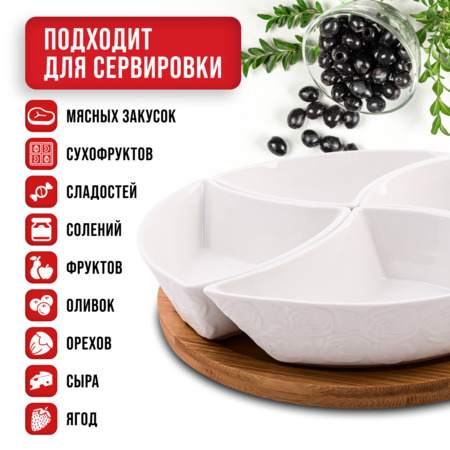 ОписаниеМенажница с рисунком роз — это изысканный и функциональный предмет, который станет неотъемлемой частью вашего стола. Изготовленная из высококачественного фарфора и натурального бамбука, она сочетает в себе нежный дизайн и практичность. Каждая секция менажницы выполнена в форме, благодаря которой вы можете разбирать конструкцию. Менажница занимает немного места и может храниться как в разобранном, так и в собранном виде. Это обеспечивает удобство хранения и использования. Идеально подходит для подачи закусок, соусов или сладостей на любой праздник или семейное торжество. Элегантный белый цвет фарфора в сочетании с тёплым оттенком бамбука создаёт атмосферу комфорта и стиля. Благодаря компактному и эстетичному дизайну менажница легко впишется в интерьер вашей кухни. Эта модель станет отличным подарком для любителей кулинарии и эстетов, добавив изысканности в их домашний интерьер.