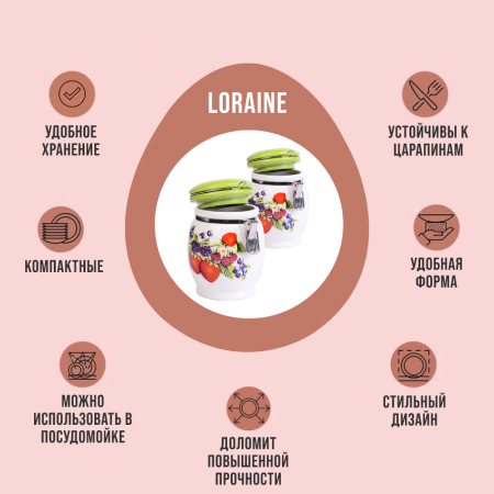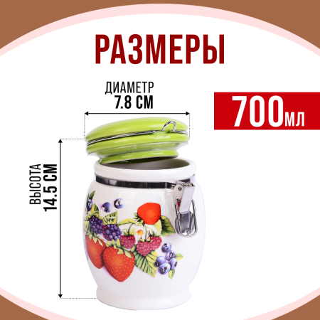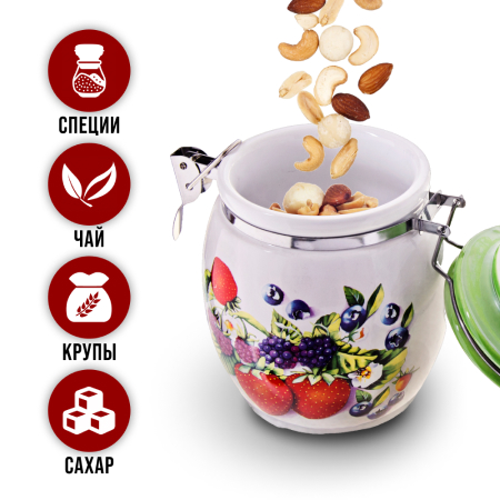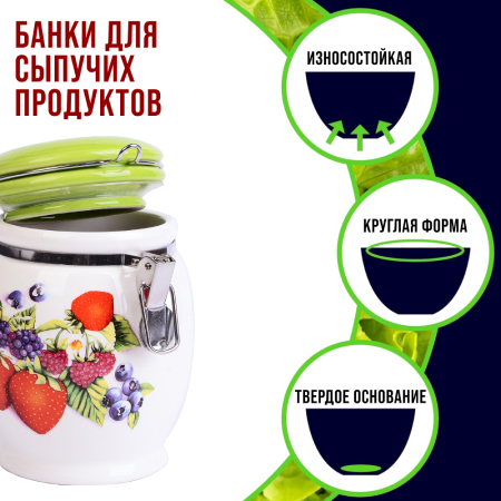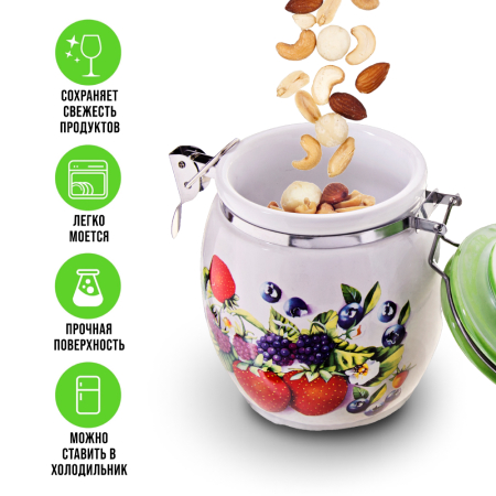 ОписаниеНабор банок для сыпучих продуктов LORAINE – это идеальное решение для хранения кофейных зерен, чая, сахара, крупы, кофе, соли, муки и многих других. Изготовлены из качественной БИО и ЭКО доломитовой керамики и украшены красивым рисунком с ягодами. Герметичная откидная крышка с силиконовым кольцом позволит сохранить максимальную свежесть с помощью зажима easy-seal, быстро и без усилий зафиксирует контейнер, не допуская попадания воздуха, света и влаги. Гладкая и ровная поверхность корпуса обеспечивает легкую очистку. Такой контейнер для хранения не только сэкономит место и сохранит порядок на вашей кухне, но и добавит уют и стильность в ваш интерьер. Яркая и оригинальная емкость для хранения сочетает в себе современный дизайн с максимальной функциональностью, а красочность оформления придется по вкусу любой хозяйке. Изделие упаковано в индивидуальную коробку. Подходит для мытья в посудомоечной машине. Оригинальный дизайн и красивое оформление позволит сделать ее отличным подарком на любой праздник. Банки для хранения - это идеальный подарок женщине на 8 Марта, День рождения, 14 февраля, Новый год и любой праздник.