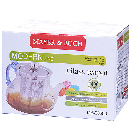 Заварочный чайник MAYER&BOCH изготовлен из термостойкого боросиликатного стекла, крышка и фильтр выполнены из нержавеющей стали.Изделия из стекла не впитывают запахи, благодаря чему вы всегда получите натуральный, насыщенный вкус и аромат напитков. Заварочный чайник из стекла удобно использовать для повседневного заваривания чая практически любого сорта. Но цветочные, фруктовые, красные и желтые сорта чая лучше других раскрывают свой вкус и аромат при заваривании именно в стеклянных чайниках, а также сохраняют все полезные ферменты и витамины, содержащиеся в чайных листах. Стальной фильтр гарантирует прозрачность и чистоту напитка от чайных листьев, при этом сохранив букет и насыщенность чая. Прозрачные стенки чайника дают возможность насладиться насыщенным цветом заваренного чая. Изящный заварочный чайник MAYER&BOCH будет прекрасно смотреться в любом интерьере. Подходит для мытья в посудомоечной машине.