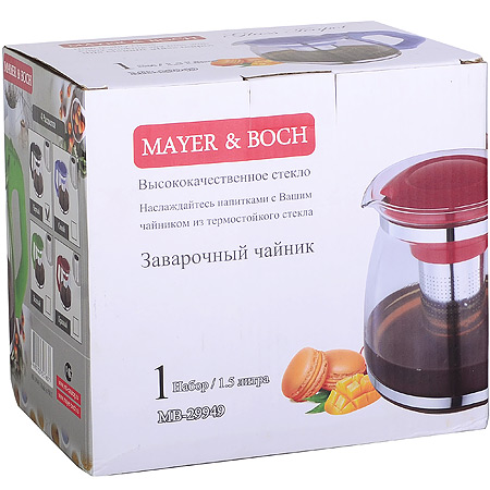Заварочный чайник MAYER&BOCH станет для вас отличным помощником в заваривании ароматного и по-настоящему вкусного чая. Корпус заварника изготовлен из термостойкого боросиликатного стекла, крышка из высококачественного пластика, а металлический фильтр из нержавеющей стали. Изделия из стекла не впитывают запахи, благодаря чему вы всегда получите натуральный, насыщенный вкус и аромат напитков. Заварочный чайник выдерживает высокие температуры, обладает стойкостью к царапинам. Благодаря своей эргономичной форме, заварочный чайник с съемным фильтром удобно лежит в руке и обеспечивает комфорт при использовании. Носик обеспечивает аккуратный разлив чая по чашкам. Заварник удобно использовать для повседневного заваривания чая практически любого сорта. Цветочные, фруктовые, красные и желтые сорта чая лучше других раскрывают свой вкус и аромат при заваривании именно в стеклянных чайниках, а также сохраняют все полезные ферменты и витамины, содержащиеся в чайных листах. Колба фильтр гарантирует прозрачность и чистоту напитка от чайных листьев, при этом сохранив букет и насыщенность чая. Прозрачные стенки дают возможность насладиться насыщенным цветом заваренного чая. Эстетичный и функциональный, с современным дизайном, заварной чайник будет прекрасно смотреться в любом интерьере. Подходит для мытья в посудомоечной машине. Наш стеклянный заварник хочется поставить в центр стола и позвать всех к столу. Изящный заварочный чайник идеален в подарок любимым!