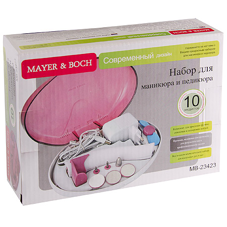 Устройте маникюрный салон не выходя из дома! Теперь такое возможно с новым профессиональным набором MAYER&BOSH для маникюра и педикюра. Прибор по уходу за ногтями позволяет удалить кутикулу, обработать мозоли, удалить огрубевшую кожу, а затем придать форму, подпилить, сгладить и отполировать поверхность ногтей. В комплект входят: внешний корпус, малая конусная насадка, большая конусная насадка, 1 цилиндрическая насадка, 2 диска с напылением, диск для полировки, адаптер, вентилятор. Удобный отсек для хранения маникюрных принадлежностей и насадок. Эргономичный ручной блок, реверс: правое и левое вращение. Элементы набора упакованы в компактный пластиковый кейс.