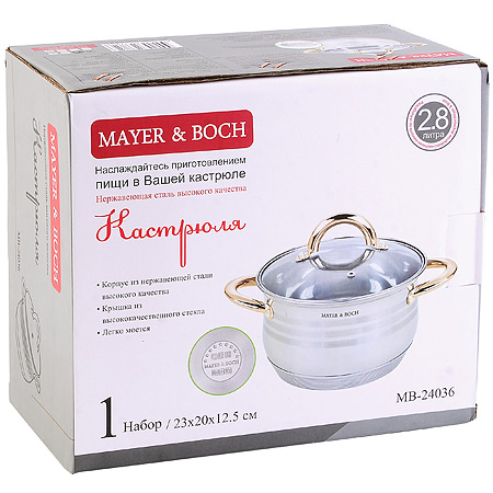 Кастрюля с крышкой из жаростойкого стекла MAYER&BOCH объемом 2,8 литра - это высококачественная кухонная посуда с толстыми стенками, литым многослойным дном и удобными золотистыми ручками, которые не нагреваются во время приготовления ваших любимых и ароматных блюд. Металлическая кастрюля с крышкой изготовлена из нержавеющей стали высокого качества с зеркальной внешней поверхностью. Внутри кастрюли имеется мерная шкала. Кастрюля из нержавеющей стали - мечта каждой хозяйки, она легко моется и не требует специального ухода, можно мыть в посудомойке. Кастрюли можно использовать на индукционных, электрических, стеклокерамических панелях и газовой плите. Кастрюля нержавейка идеальна для приготовления множества блюд: для варки каш, молока, овощей, яиц, мяса, наваристых супов и бульонов, круп, макарон, компотов, варенья, различных соусов и подлив, тушения и готовки горячих блюд. Кастрюля для индукционной плиты быстро нагревается и равномерно передает нагрев на всю свою поверхность индукции, благодаря особой конструкции дна. Кастрюля имеет ряд преимуществ - она с крышкой, высокая, у нее толстые стенки и дно, полностью безопасна для здоровья человека, не выделяет вредных веществ при контакте с пищей, долго сохраняет тепло, и никогда не потемнеет. Кастрюли из нержавейки MAYER&BOCH – лучшее решение для приготовления вкусных и ароматных блюд. Благодаря высокотехнологичному оборудованию, она безупречного качества и по доступной цене. Кастрюля со стеклянной крышкой MAYER&BOCH - это красивая посуда, очень полезный и нужный подарок на День рождения, Новый год, на новоселье, для мамы, бабушки, подруги.