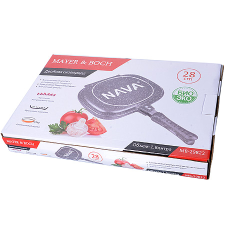 ОписаниеСковорода MAYER&BOCH выполнена из качественного литого алюминия и снабжена антипригарным покрытием особой прочности. Больше не нужно переворачивать еду, теперь можно переворачивать всю сковороду целиком. Эргономичные ручки с магнитной защелкой для безопасного приготовления пищи и удобной переноски. Силиконовый уплотнитель не позволяет сокам вытечь или испариться, тем самым удерживая тепло и сохраняя вкус продуктов. Также в наборе идет запасная резинка. Антипригарное покрытие легко чистить даже без использования специальных моющих средств. Сковорода прекрасно подходит для приготовления мяса и рыбы, стейков, овощей и даже выпечки. Пищу можно готовить без использования растительного масла. При желании сковородка делится на две раздельные емкости одинаковой вместимости.