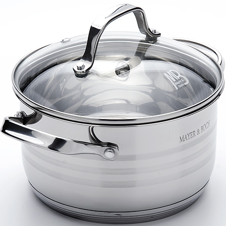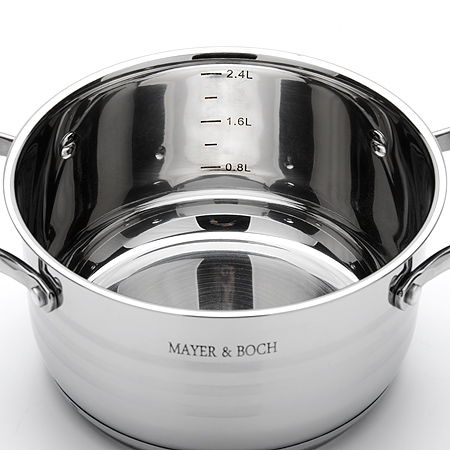 ОписаниеНабор кастрюль MAYER&BOCH изготовлен из высококачественной многослойной нержавеющей стали c толщиной стенок 5 мм и усиленным индукционным дном. Этот набор кастрюль предназначен для здорового и экологичного приготовления пищи, многослойная сталь обеспечит быстрый нагрев продуктов и надолго сохранит тепло. Изделия снабжены крышками из термостойкого стекла с паровыпуском и металлическим ободом, а также удобными не нагревающимися стальными ручками. Внешняя поверхность кастрюль с зеркальной полировкой, имеет гравировку в форме колец. Также кастрюли имеют внутреннюю шкалу литража. В комплекте 6 предметов: 3 кастрюли, 3 стеклянных крышки. Подходит для использования на всех типах плит, включая индукционные. Подходит для мытья в посудомоечной машине.