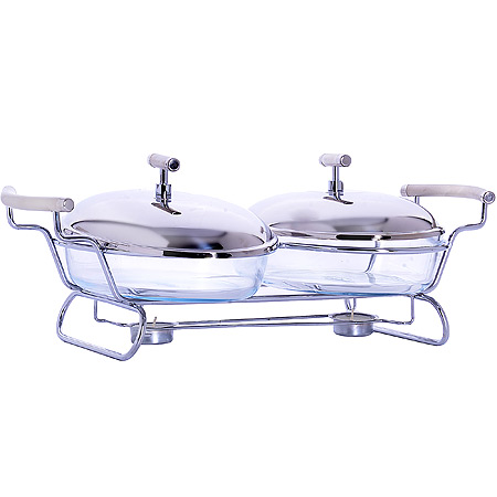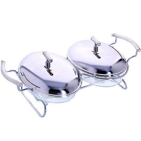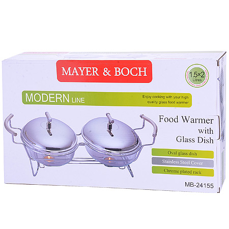 ОписаниеДвойной мармит MAYER&BOCH выполнен из стекла и нержавеющей стали. Стеклянные чаши располагаются на стальной подставке с подсвечниками для чайных свечей, снабженной двумя хромированными ручками. Свечи, устанавливающиеся на подставке, нагревают чаши снизу, таким образом поддерживая нужную температуру приготовленных блюд. Крышки из качественной нержавеющей стали с удобными хромированными ручками плотно прикрывают чаши сверху, в свою очередь также не давая остыть блюдам. Благодаря своему элегантному дизайну, мармит с приготовленным блюдом можно сразу подавать на стол, не перекладывая еду на сервировочные тарелки. Изящный, с современным дизайном, мармит украсит любой праздничный стол, а блюда в нем будут всегда теплыми и ароматными. Подходит для мытья в посудомоечной машине. Подходит для хранения в холодильнике.