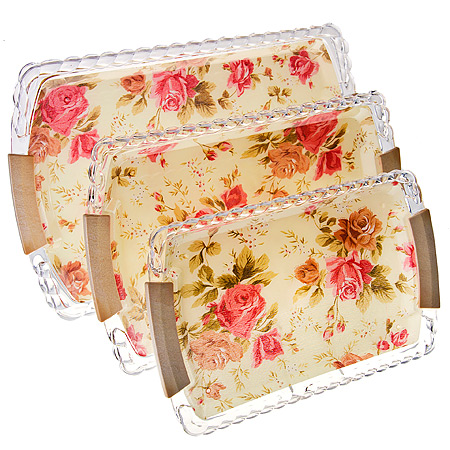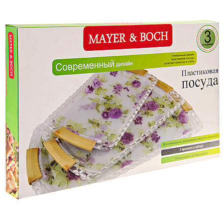 ОписаниеНабор подносов MAYER&BOCH состоит из 3-х прямоугольных подносов разного размера, выполненных из прочного высококачественного пластика. Подносы украшены красочным изображением, оформлены изящной резной кромкой по краям иоснащены двумя удобными широкими пластиковыми ручками, стилизованными под дерево. Такие подносы отлично подойдут для красивой сервировки различных горячих блюд, закусок, фруктов и десертов на праздничном столе. Набор подносов MAYER&BOCH станет отличным подарком на любой праздник. Подходит для мытья в посудомоечной машине.